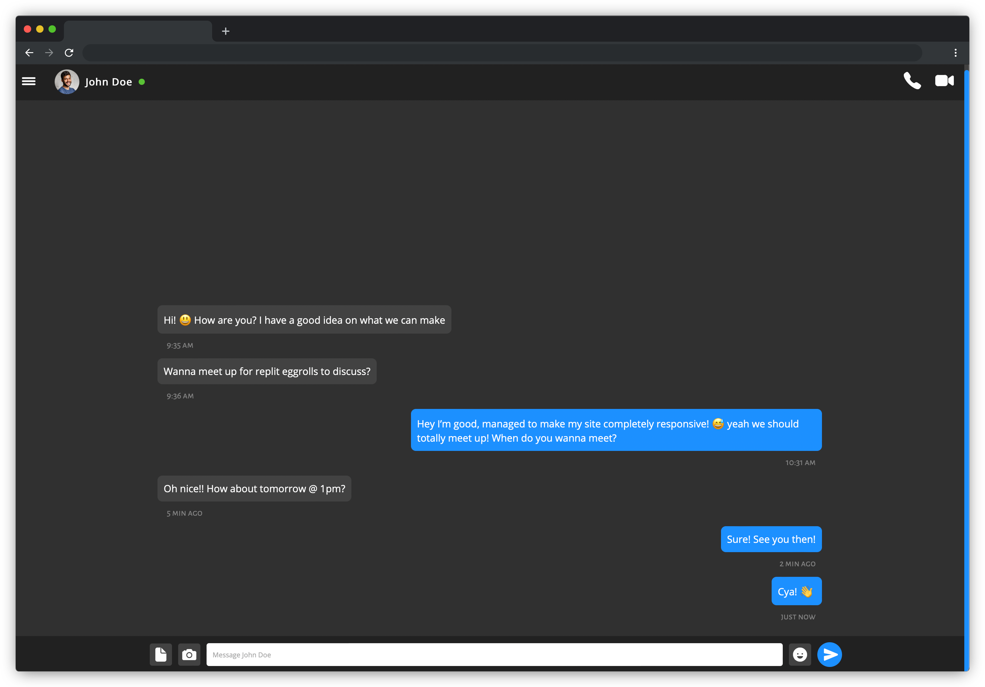 The front-end design of a chat app for the Weekly 6 challenge. Features a sidebar with ongoing conversations, online status', a way to send messages, files, and emojis, and icons for calling.