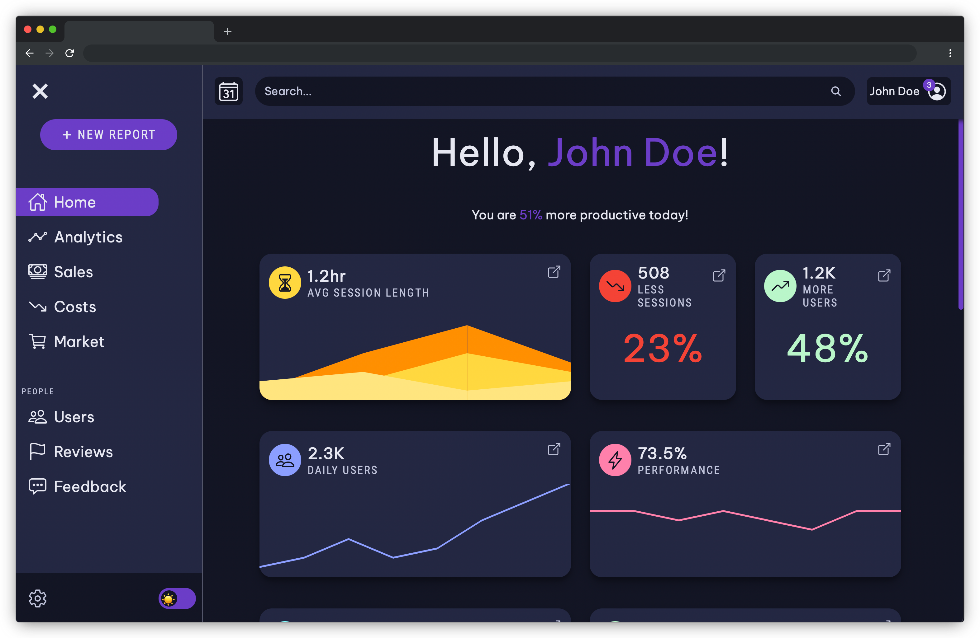 The front-end of a dashboard. Fully responsive and has light/dark theme! Includes a sidebar, cool animations, charts, and more!