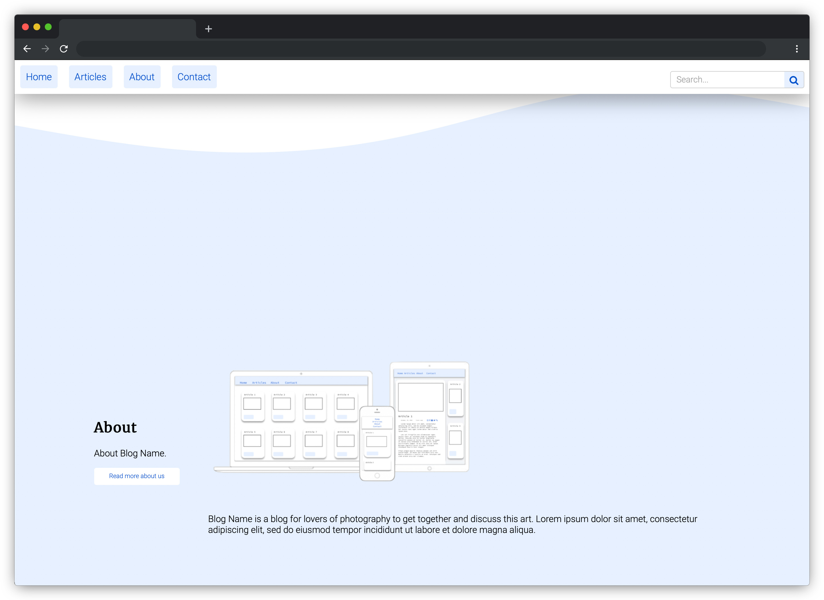 The responsive frontend of a blog with the theme of photography. Features many different pages such as a home page, articles page, about me/us page, and more!