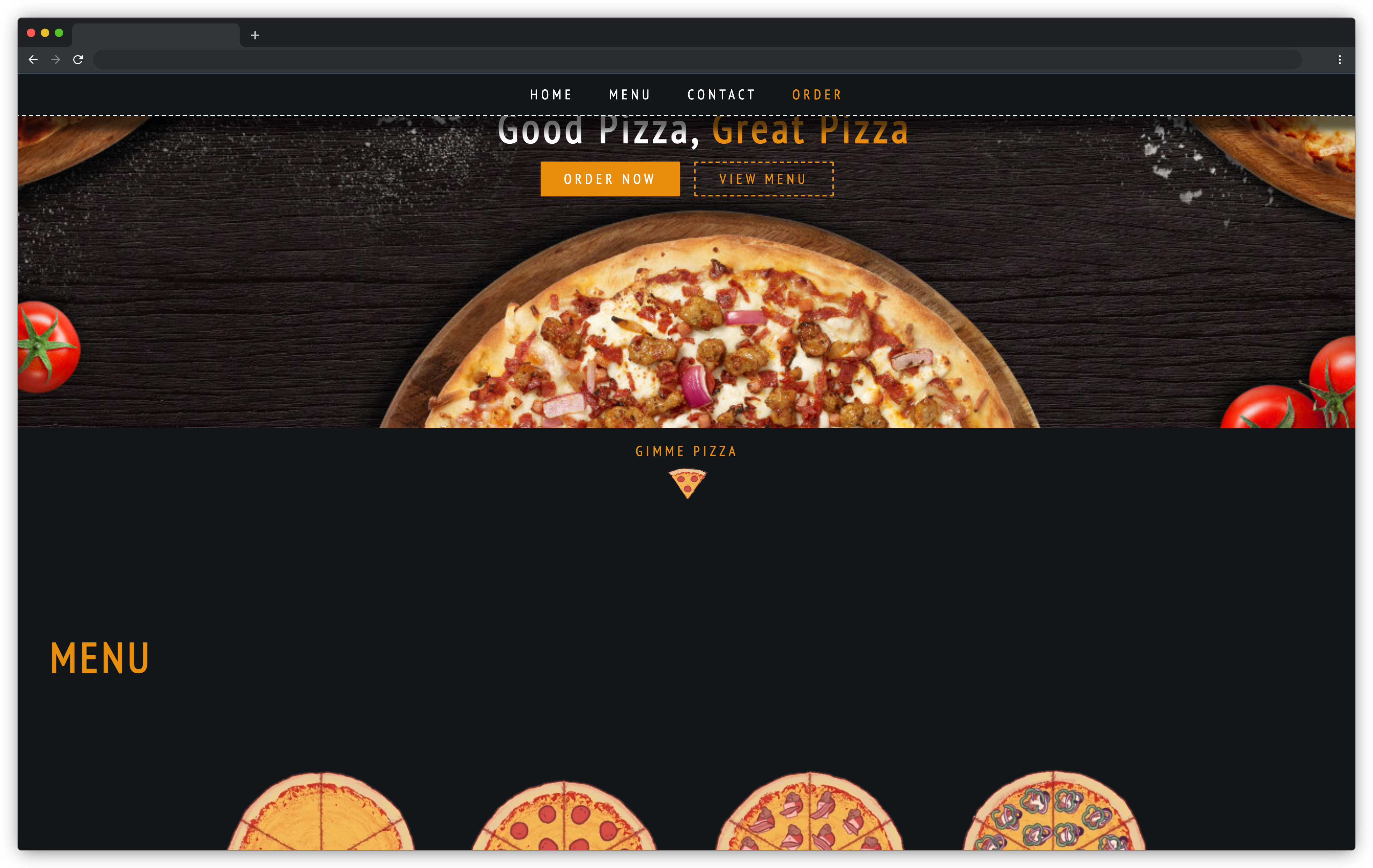 A responsive pizza restaurant website! Based on the game Good Pizza Great Pizza, includes a home page, menu page, why us page, contact page (business hours + book a table + contact info), footer with links, order page, and even a page to create your own pizza!