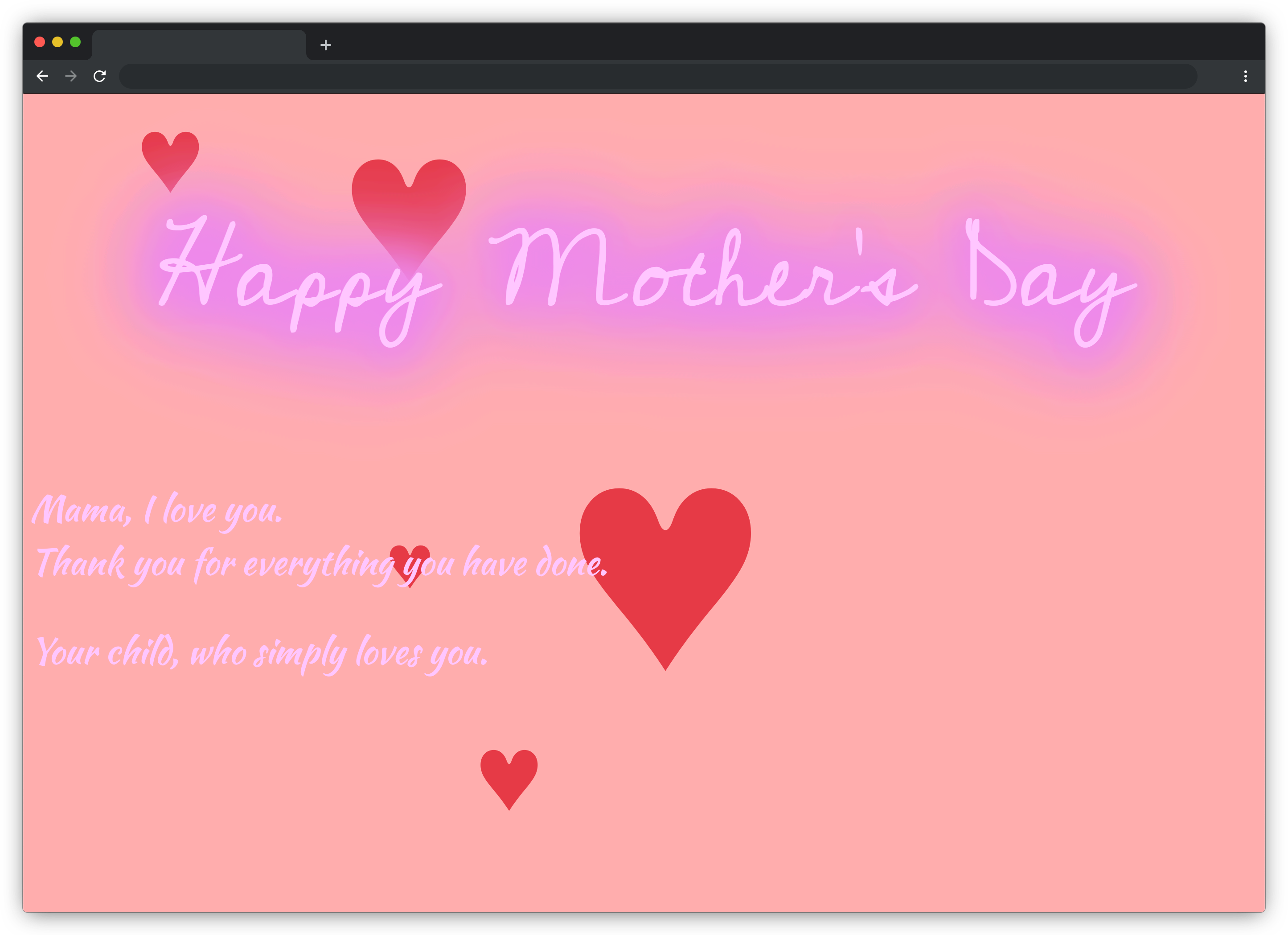Happy Mother's Day! A gift for all mothers, made with purely with HTML and CSS. Features fade-in title, text, floating hearts, and it's also responsive.