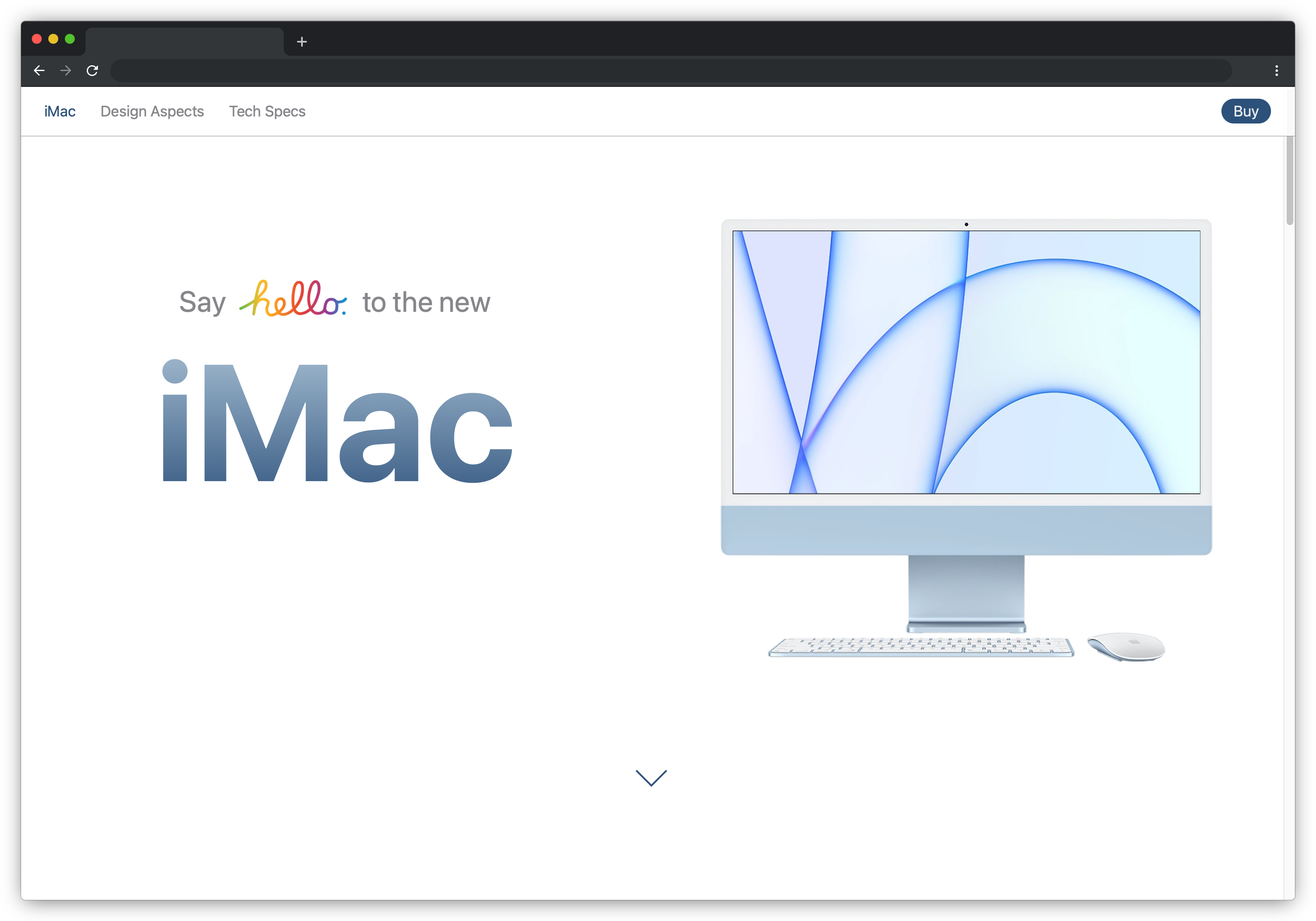 A product page for the Weekly 5 challenge. A responsive site with a navbar, landing page, features page, and buy page. Showcases the colors, design aspects, tech specs, and accessories of Apple's iMac 24".